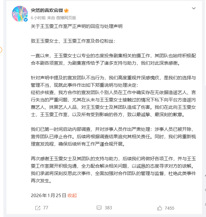 1月25日凌晨,王玉雯工作室全平台发声明,全面停止《突然的喜欢》的一切宣传工作。声明称牛宝宝,剧方合作的宣发团队无端恶意造谣演员,挑拨王玉雯方和平台的关系。